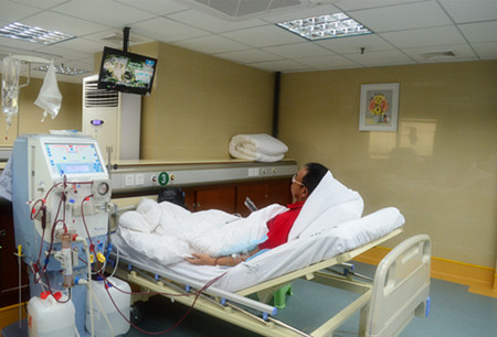 【广州圣丹福医院每个血透单元环境舒适,设施齐全,患者可一边看电视一边做血透】