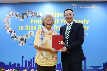 来自印尼的华人王优华女士便是其中之一,几年前,66岁的王优华和丈夫陈永远从印尼来广州参加广交会,她因身体不适到广州圣丹福医院做全身体检,没想到发现了乳腺癌。住院期间,丈夫陈永远一直守护在妻子身边,安慰她照顾她,让她更有勇气与癌症抗战。在治疗期间,医生鼓励她要乐观积极,这对治效果果有帮助,于是她在治疗之余经常出行,丈夫陪着她走遍了中国的很多名胜古迹。“旅途中我感觉到精神非常愉快,身体也跟着变得很轻松,一点都没有生病的感觉。”王优华表示。去年,在肿瘤治疗的关键期过后,广州圣丹福医院还特别为她和丈夫陈永远举办了令人难忘的中国式金婚庆典。如今,五年过去了,她的身体健康如常。