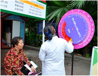 在BMI指数检测区,一位义诊护士正在跟市民讲解BMI指数的测量方法。