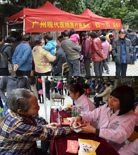 在广州圣丹福医院医疗服务点,义诊医生们免费为市民提供血压、血糖检测,医保咨询等服务