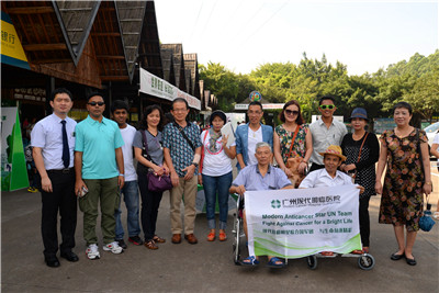 这些癌症病人分别来自泰国、印尼、越南、孟加拉和柬埔寨,目前都在(中新合资)广州圣丹福医院进行治疗,因为心态乐观,他们被评为年度“抗癌勇士”。抗癌勇士中年龄大的有61岁,小的是44岁,绝大多数已是身患直肠癌、肺癌、肝癌、乳腺癌、食道癌的晚期患者,不过有的经过治疗已经可以带癌正常生活。当天,他们特意脱下病服,走出冰冷的病房,以正常人的姿态来到户外,亲近自然和动物,以此愉悦身心,表明勇敢与癌魔对抗的信心和勇气,也鼓励其他癌症病人走出自我,迎接阳光,一起角逐生命的精彩。