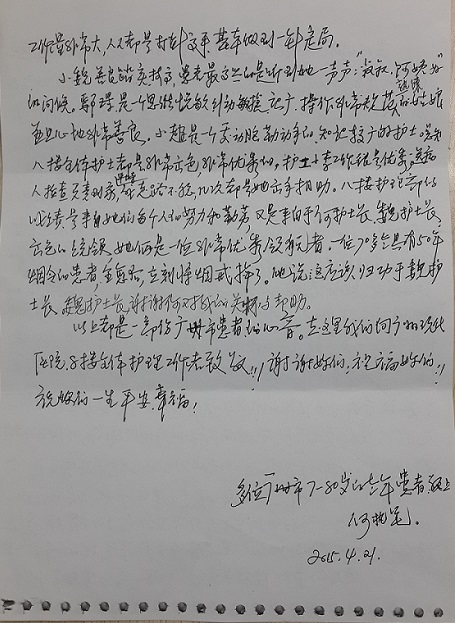 出院后,家人惊喜地发现,何阿姨的整个精神头都不一样了!疼痛不见了,睡得香了,脸上很快有了笑意,说话做事也都利索起来,家里的氛围也变得轻松愉快!儿子感慨道“这状态,跟20年前一个模样!”而何阿姨心中明白,之所以有这样的幸福晚年,正是因为有广州圣丹福医院医护人员的用心治疗。所以,何阿姨在儿子的鼓励下,写下了这两大页的感谢信。她说:“我以前也是医护这条线的,我能够分辨出护士是不是用心,够不够专业!你们都很耐心、细心,技术也很熟练!这一切我都看在眼里记在心里,所以我一定要写这封感谢信去感谢她们、表扬她们、鼓励她们。”