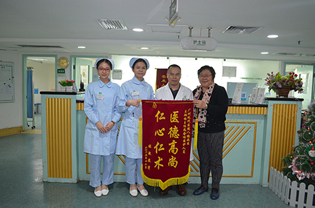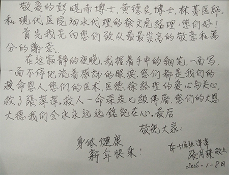 2016年1月8日,患者张萍萍和张月珠将感谢信送到医护人员手里,信中对肿瘤科彭晓赤主任、黄德良医生、林菁医生、徐文虎经理等广州圣丹福医院的医护人员表示崇高的敬意和万分的谢意。“你们都是我们的救命恩人,你们的医术、医德我们会铭记在心。”