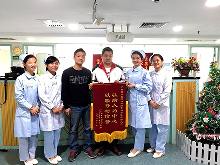 2016年1月4日下午,四名病友联名敬赠锦旗给广州圣丹福医院血透中心和八楼病区全体医护人员,感谢医护人员在他们治疗过程中以精湛的医术和无微不至的关怀对他们给予帮助。这四名病友长年累月在广州圣丹福医院血透中心接受治疗,与医护人员的关系如亲人一般。