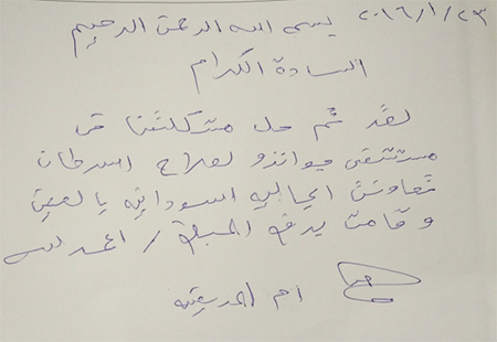 以上信笺是苏丹商会会长:阿卜杜·法黑德·勒翰麻写来的,感谢广州圣丹福医院肿瘤七病区全体医护人员及两位阿语翻译在苏丹国籍患者艾拉住院期间无微不至的照顾,感谢医院对患者的帮助。“愿真主祝大家工作顺利,身体健康!”