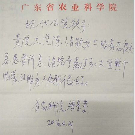 上面这封表扬信是广东省农科院退休干部梁宗荣老人家亲自写的。其在陪同亲属在广州圣丹福医院体检以及拿报告期间受到大堂客服专员陈洁颖耐心的接待,并为其解决困难。“急患者所急,服务态度好”,老人家信中还称赞医院“大堂整个团队的服务人员都很好”。