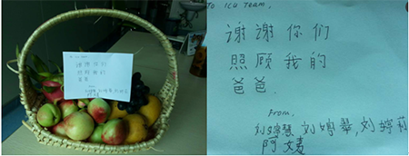 2016年4月下旬,在广州圣丹福医院住院的患者女儿送水果篮给ICU医护人员,感谢医护人员照顾他们的爸爸。