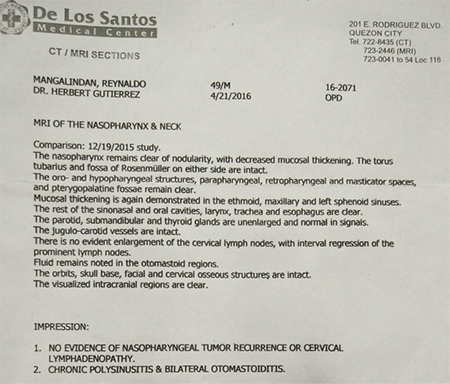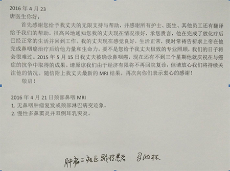 这是一封从海外寄过来的感谢信。海外患者马纳林患有鼻咽癌,到广州圣丹福医院经过近一年的治疗,出院后恢复情况理想,并已回到工作岗位。其妻子特寄来感谢信与复查报告,感谢广州圣丹福医院肿瘤科的唐祥专医生、所有医护人员以及翻译人员对他的帮助。