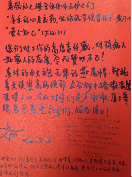 这是综合病区陈爱和何郁清送来的感谢信,感谢综合病区吴伟医生及全体护士,信中写道:“真心真意,救死扶伤;耐心专注,咫尺医心;对患者尊重,理解,关心,帮助。”