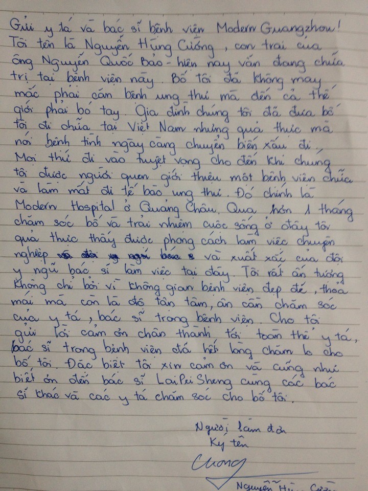 这是来(中新合资)广州圣丹福医院自5楼39床越南肿瘤患者阮雄强写来的一封感谢信,表达他父亲在住院期间给予他们关心和帮助的医护人员的感激之情。卓越的医疗技术、耐心负责的态度、无微不至的关心着患者及家属的医务人员让患者对治疗充满信心。在信中感谢医护人员无怨无悔的投身于平凡而伟大的医疗工作,所有的这一切都在平凡中孕育,这种平凡感动每一位患者及家属。