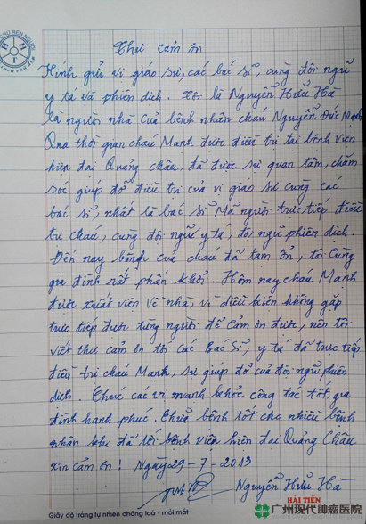 不知不觉中,阮德孟已经来广州圣丹福医院复诊了7次,通过综合的治疗,他的病情已经获得良好的控制。阮德孟父母有感于儿子在治疗期间得到医生、护士和翻译人员的治疗和照顾,特地写了封信以表达他们深沉的谢意,并希望广州圣丹福医院能够帮助更多的癌症患者和家庭!