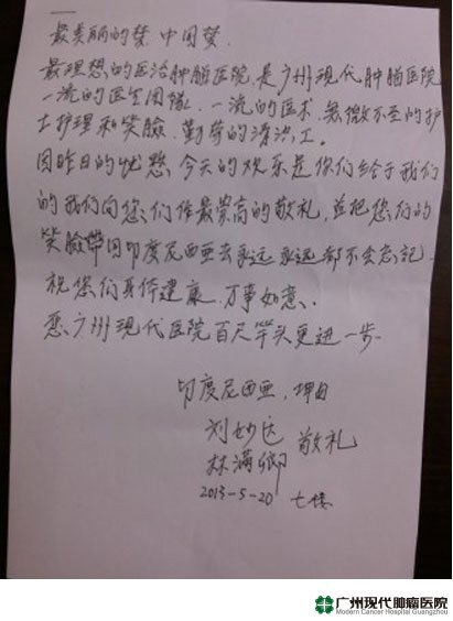 为了寻求更好的治疗,刘妙达选择了(中新合资)广州圣丹福医院。经过一系列的检查后,医生为他制定了介入治疗+中医中药+放疗的综合治疗的方案。这综合治疗的方法即可提高效果,还消除了刘妙达心中的忧虑——手术。精湛的医术和无微不至的护理关怀,使得刘妙达的病情很快的得到了好转,便血的情况渐渐的不再出现了,四肢的麻木感也消失了。这6年来,刘妙达始终谨记医生的嘱咐,从饮食到护理都十分注意,并且坚持定期来院复诊。事实也证明了他的选择和坚持是正确的。6年过去了,刘妙达的肿瘤不但没有复发,而且精神状态也恢复至患病之前一般,充满力量。为了表达自己多年来的感激之情,刘妙达和家属在近日特地写来感谢信一封。原文如下: