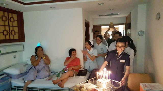 2016年8月18日,由于签证马上到期,来自菲律宾的结肠癌患者阿乐的大女儿KarenFlynn即将返往美国。考虑到平时与爸爸相处的机会甚少,KarenFlynn决定把即将到来的生日提前与爸爸一起过。在生日会开办当天,我们始终看见一个瘦小的身影忙碌地穿梭在病房、护士站、医生站三点之间。没错,那就是莫长风。