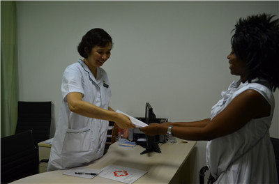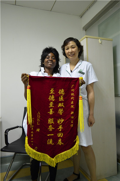 9月25日,在(中新合资)广州圣丹福医院妇科主任郑颂的办公室,一位黑皮肤的年轻女子将一封感谢信和一面写着“德医双馨,妙手回春”的锦旗送给了郑颂主任!