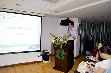 8月31日下午4:30,(中新合资)广州圣丹福医院月度全院员工大会在9楼会议室隆重召开,总经理林绍华、院长王怀忠、副院长陈兵及全体在岗员工参与了会议。