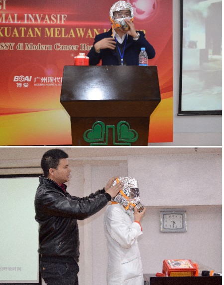 李宝财教官演示防烟面具的使用(上)和李德佳教官指导员工使用防烟面具(下)