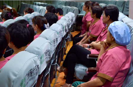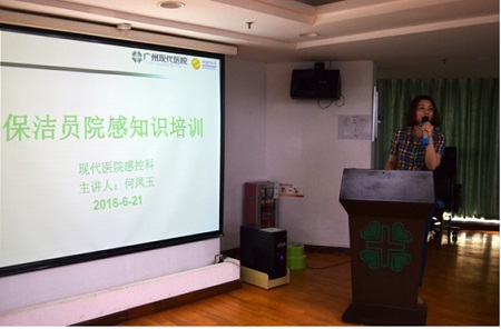 6月21日,广州圣丹福医院组织2016年度全院保洁员院感知识培训,医院感控科何凤玉主任担任主讲师,全院负责保洁工作的员工参加培训。