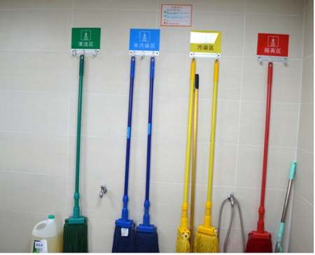 医院的清洁工具都按照不同颜色分区摆放