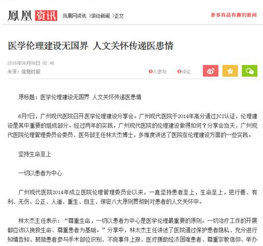 2016年6月7日,我院举办面向社会的伦理建设分享会,引起广泛关注,凤凰网、新浪网、搜狐网等国内各大新闻媒体纷纷进行大量报道。