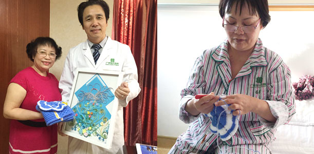 图为吴氏秋香的姐姐亲手为彭主任送上手工挂画,还有给彭主任小孩的帽子与衣服。彭主任接过礼物感动地说道:“等我小孩穿上这帽子跟衣服,我一定拍张照片给你看。真的十分感动,感谢患者及家属对圣丹福广州圣丹福肿瘤医院的赞赏与肯定。”