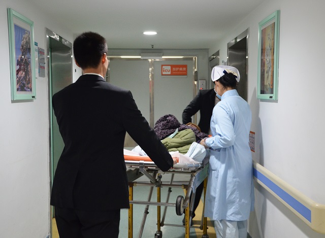 接电话的工作人员耐心询问基本信息,发现患者家就在医院旁边的小区。于是医护人员和后勤人员带上基本医疗工具、担架床紧急前往,司机也开车来到患者楼下等候。综合病区的医护人员也做好准备,迎接患者。从接到电话到把患者送入病房,整个过程仅10分钟。