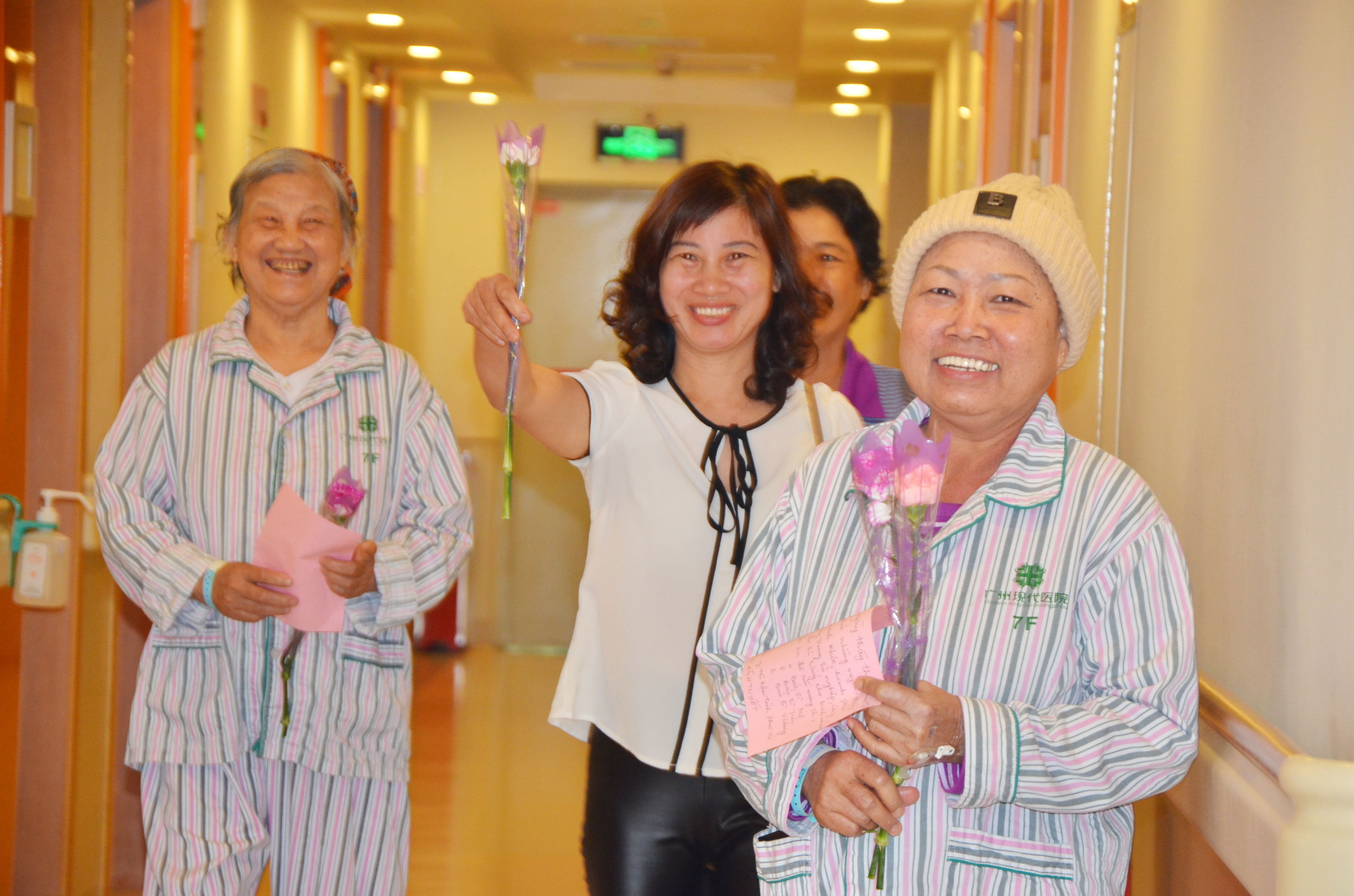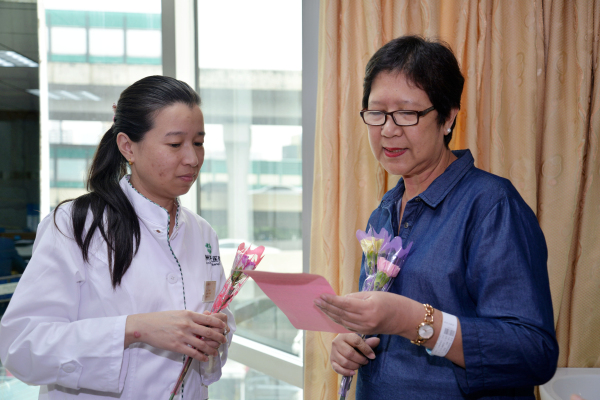 来自菲律宾的苏珊心思细腻,考虑周全。当她把康乃馨献给病区寇主任时,她饱含深情地把感谢信的内容大声朗读分享了出来。“谢谢专业、高效的医生团队,以及护士和其他工作人员照顾我们,让我们觉得在这里非常舒适,就像在自己家一样。希望广州圣丹福肿瘤医院越来越好,我会向上帝祈祷,希望你们可以继续为患者提供出色的和富有同情心的医疗服务,帮助我们患者身体康复,越来越健康。愿上帝保佑…….”