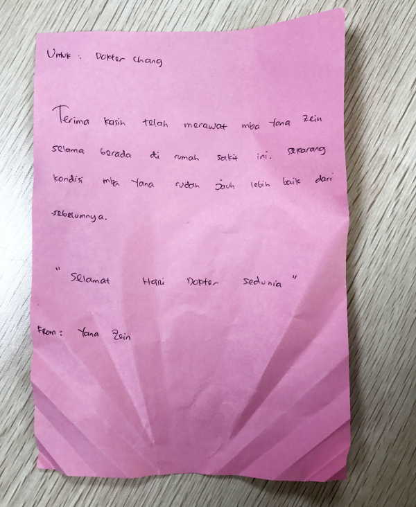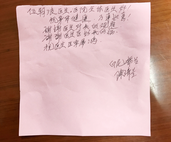 有医生因下夜班而不在办公室的,患者就把感谢信摆放在他们办公桌最显眼的位置,以便他们上班就能第一眼看到。以下这封感谢信来自印尼棉兰的一位华人患者。她写道:“伍医生,医院全体医生好!祝身体健康,万事如意!谢谢医生对我的观(关)照,谢谢医生医好我的病,祝医生医学展鸿。”